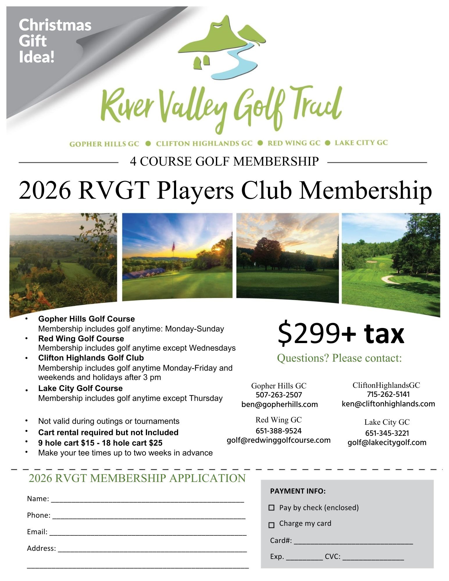 Play 4 great courses with the River Valley Golf Trail Players Club Membership. Purchase online or at one of our 4 courses.